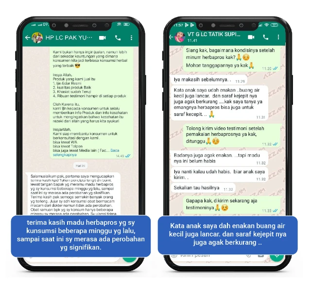 Madu Herbapros sudah berhasil membantu banyak orang mengatasi keluhan prostat, hal ini dibuktikan dengan banyak testimoni yang masuk harian yang tak terbendung banyaknya, baik melalui percakapan WA, video, ulasan di marketplace, dll.